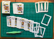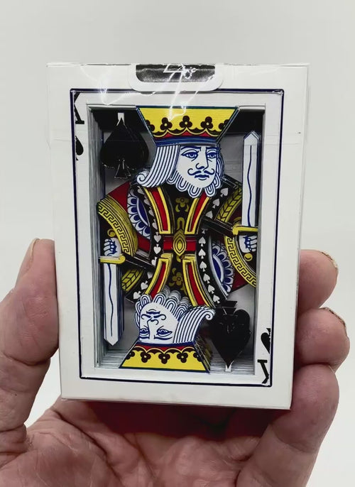 Every card is cut by hand using only an X-acto knife. Each card becomes more and more detailed. When all 56 cards are stacked together it creates a beautiful 3-D pattern. Each deck takes about 8 hours to create. No glue or adhesives are ever used. Each deck is inside of the card box, sealed with the cellophane wrapping on. The deck is then placed inside an acrylic protective case which rests on a miniature black wooden easel to be proudly displayed for all to see. It’s simply a beautiful piece of art!