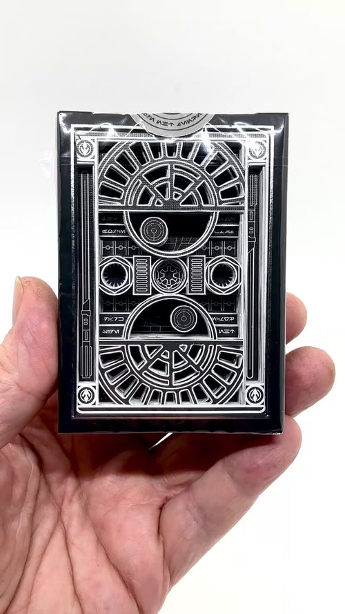 Welcome to the dark side with this hand-cut 3D piece of art that looks through the window of the Imperial Throne Room. This black and silver foiled deck is bad ass!