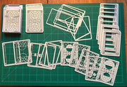 Every card is cut by hand using only an X-acto knife. Each card becomes more and more detailed. When all 56 cards are stacked together it creates a beautiful 3-D pattern.