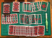 Every card is cut by hand using only an X-acto knife. Each card becomes more and more detailed. When all 56 cards are stacked together it creates a beautiful 3-D pattern.