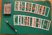 Every card is cut by hand using only an X-acto knife. Each card becomes more and more detailed. When all 56 cards are stacked together it creates a beautiful 3-D pattern.