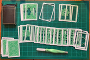 Every card is cut by hand using only an X-acto knife. Each card becomes more and more detailed. When all 56 cards are stacked together it creates a beautiful 3-D pattern.
