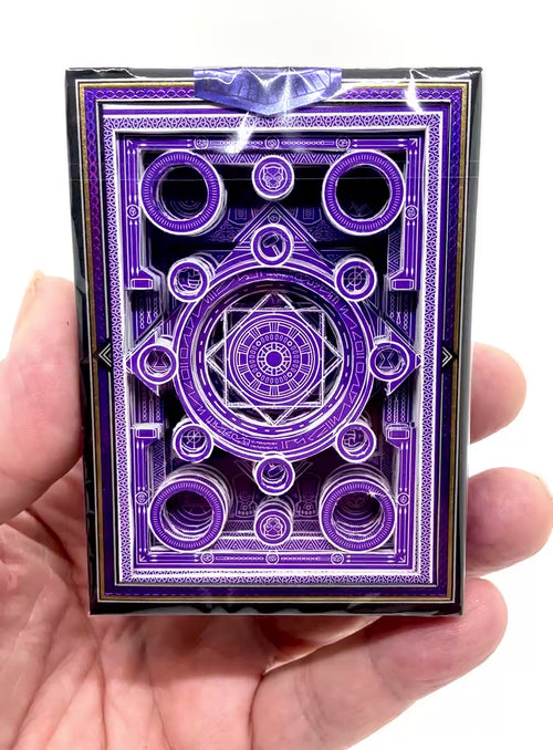 This purple iridescent, cosmic foil 3D deck of cards shimmers at every light angle. The gold foil and precise embossing is truly representative of the legendary Infinity Saga.