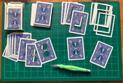 Every card is cut by hand using only an X-acto knife. Each card becomes more and more detailed. When all 56 cards are stacked together it creates a beautiful 3-D pattern. Each deck takes about 8 hours to create. No glue or adhesives are ever used. Each deck is inside of the card box, sealed with the cellophane wrapping on. The deck is then placed inside an acrylic protective case which rests on a miniature black wooden easel to be proudly displayed for all to see. It’s simply a beautiful piece of art!